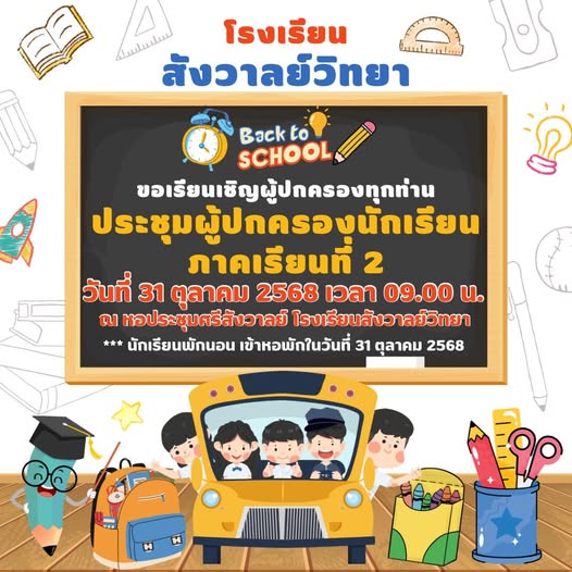โรงเรียนสังวาลย์วิทยา ขอเรียนเชิญผู้ปกครองทุกท่าน เข้าร่วมประชุมผู้ปกครอง ภาคเรียนที่ ๒ ประจำปีการศึกษา ๒๕๖๘ ในวันที่ ๓๑ ตุลาคม พ.ศ.๒๕๖๘ เวลา ๐๙.๐๐ น. ณ หอประชุมศรีสังวาลย์ โรงเรียนสังวาลย์วิทยา